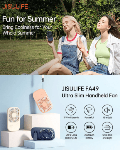 Quạt cầm tay đa năng Jisulife FA49 Với thiết kế nhỏ gọn và thời trang, pin sạc lại, và nhiều tùy chọn tốc độ, quạt này là một sản phẩm không thể thiếu cho phụ nữ, các bà mẹ và các cô gái, những người đề cao cả tính năng và thời trang.